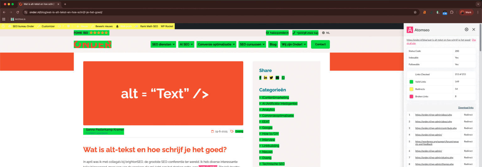 Lars zegt hierover: “Wat handig is, is dat de extensie visueel op een pagina laat zien wat de statuscode van alle links is. Dat doet hij met kleurtjes: een link naar een 404-pagina is rood, een link met een 301-redirect is geel en werkende links zijn groen.”