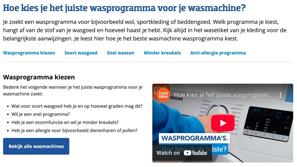 Coolblue laat goed zien hoe het kan. Hun content helpt klanten voor én na de aankoop. Als je een wasmachine koopt, ontvang je automatisch een e-mail met praktische tips. Die informatie staat ook overzichtelijk op de website. Natuurlijk kun je dezelfde vragen ook aan AI stellen, maar bij Coolblue weet je zeker dat het klopt en aansluit bij jouw situatie. Dat is waar EEAT het verschil maakt. Coolblue scoort op al die punten met tekst, video, reviews en visuele uitleg. En dat is precies waar AI voorlopig nog niet tegenop kan.